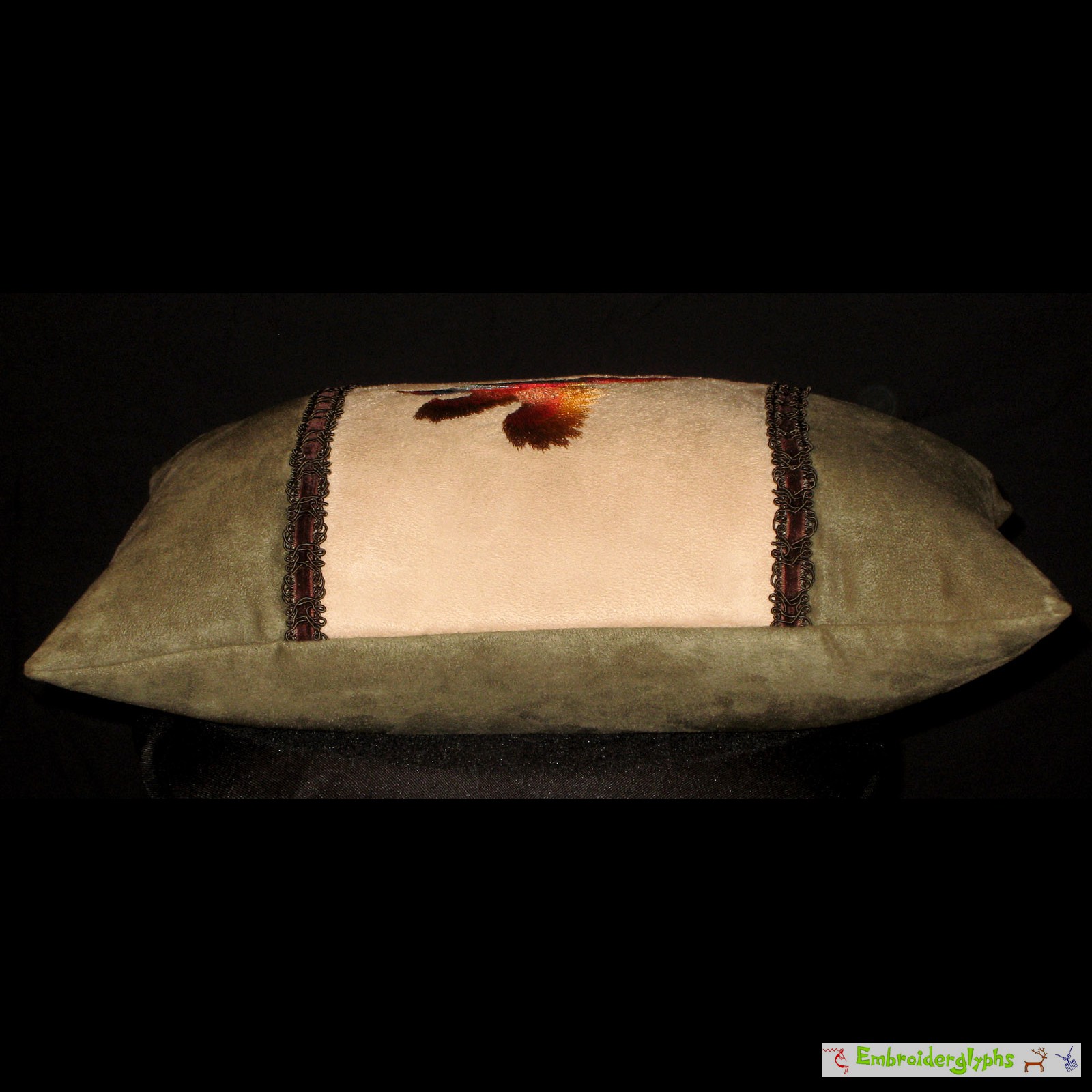 This is a one-of-a-kind custom accent pillow. The design has an elegant feel. The design is a Pheasant in flight — just after taking off.