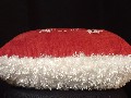 The design has 6 realistic snowflakes. It uses soft red upholstery fabric on the front and an off-white fluffy fabric on the back. The fabrics have a very nice, soft feel.